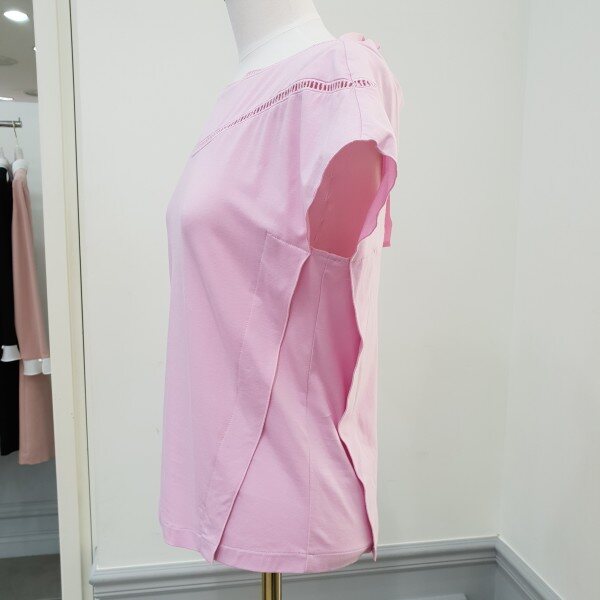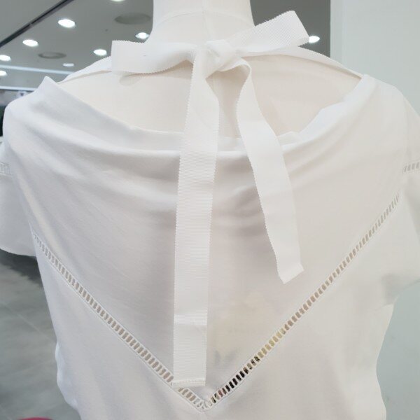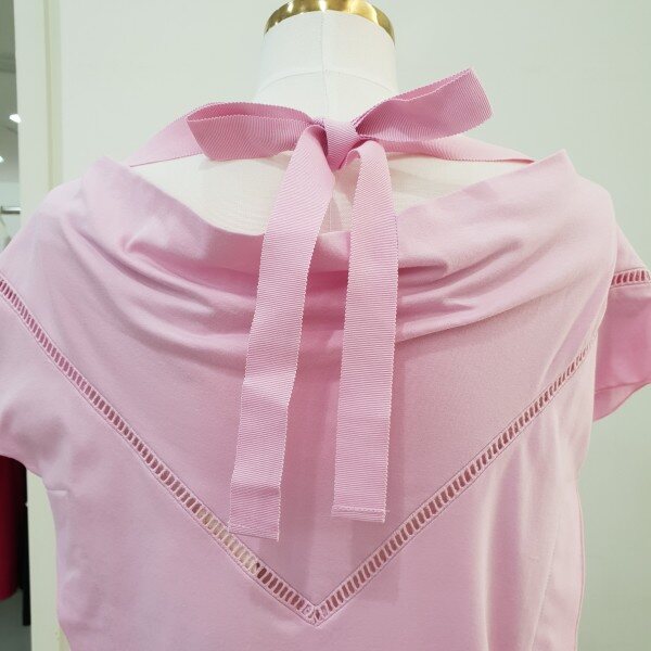 슬림핏 입니다~?소매느낌으로 적당히팔뚝커버되며~ 뒷넥부부은자연스럽게 살짝늘어지는정도리본 조절가능