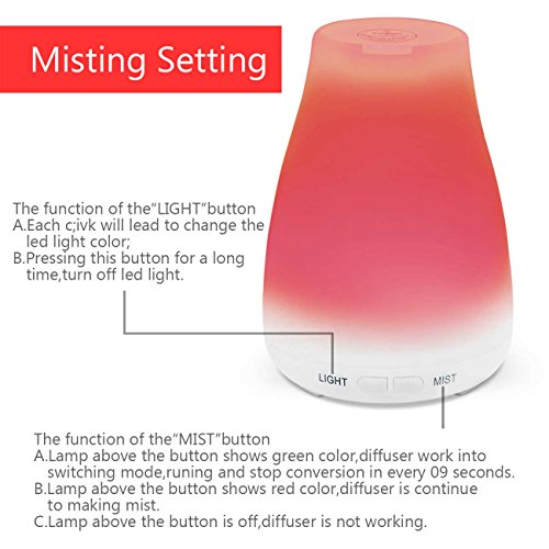 - Features:The Oil Diffuser include 7 color changing lamps for your choice:Aroma Diffuser Spark Your Kid's Imagination with 7 Changing Mood Lights, each of which is adjustable between Bright and Dim modes, and could be set steady on. Great night light for young children scared of the dark at bedtime. Color including: Green, Dark blue, Red, Yellow, Pink, Light blue, White.