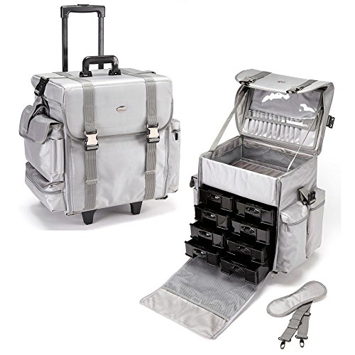 Studio : Seya Publisher : Seya Binding : Misc. Product Description This is the ultimate professional soft-sided rolling makeup case for those who are looking for a train case that is both focused on organization and travels easily. It has many forms of makeup and beauty tool storage throughout its structure and its lightweight, fabric construction makes it easy to transport as you travel in the course of your work. Make no mistake though; this cosmetic case is a heavyweight when it comes to storage capability. There are eight large plastic drawers that can be used to finely organize your many makeup and cosmetic items. Tools such as tweezers and eyelash curlers can be kept here as well as foundation and nail polish bottles. Each drawer slides firmly into place, keeping your delicate cosmetics secure and organized. On the left side there is a tissue dispenser, two makeup brush holders, one horizontal and one vertical zip pocket. There are an additional two vertical pockets on the right side for long items such as nail files or mirrors. The central storage well can be used for large items such as spray bottles and palettes. Additional storage space can be found in the mesh pockets around the sides of the storage well as well as a zippered one on the underside of the lid. Telescoping trolley fully extends to 38" Right side zip pockets: 5"L x 2" D" x 10" H Front Flap Zipper Pocket: 13" L x 10"W Bottom hollow space dimension: 14" L x 10" W x 4.25" H Plastic tray dimensions (each): 9.25" L x 5.75" W x 2.25" H Overall case dimensions: 17" L x 12" W x 19.5" H 0