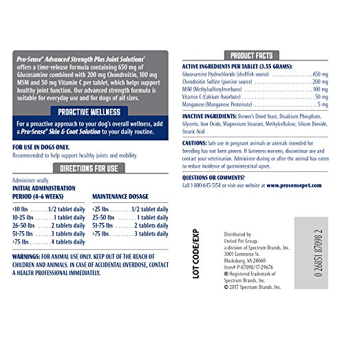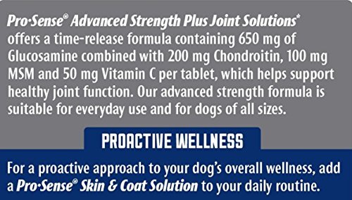 Pro-Sense brand offers a variety of proactive, sensible solutions for all of your pet’s healthcare and wellness needs. We know pet parenting can be tough, which is why we’ve improved our ingredients and benefits to make it easier than ever to care for them like any other member of your family. Pro-Sense Advanced Strength Plus Joint Solutions offers a time-release formula containing 650 mg of Glucosamine combined with 200 mg Chondroitin, 100 mg MSM and 50 mg Vitamin C per tablet, which helps support healthy joint function. Administer the chewable tablets orally to help support healthy joints and mobility for your dog. Get ready for the next big adventure by taking care of your pup’s joints. Our advanced strength formula is suitable for everyday use and for dogs of all sizes. Pro-Sense brand offers a wide variety of products to help you create a comprehensive healthcare routine for your dog.Feature