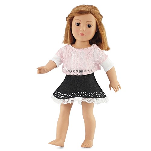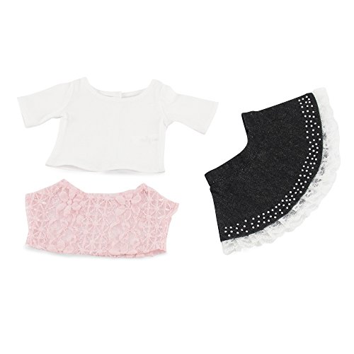 - Gift-Boxed! Packaged in classy pink gift box. Trendy 3 piece skirt, shirt and lace crop top designed and manufactured for Emily Rose Doll Clothes (TM).