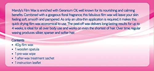 Studio : Lee-Chem Laboratories Publisher : Lee-Chem Laboratories Binding : Misc. Product Description Mandy's Film Wax is enriched with Geranium Oil, well known for its nourishing and calming benefits. Combined with a gorgeous floral fragrance, this fabulous film wax will leave your skin feeling soft, smooth and pampered. As only an ultra-thin application is required, it makes this quick drying film wax economical to use. The peel-off wax delivers long-lasting results for up to 4 weeks, is ideal for all over body use and works on even the shortest of hair. Over time, regular waxing produces silkier, sparser and softer hair. 0