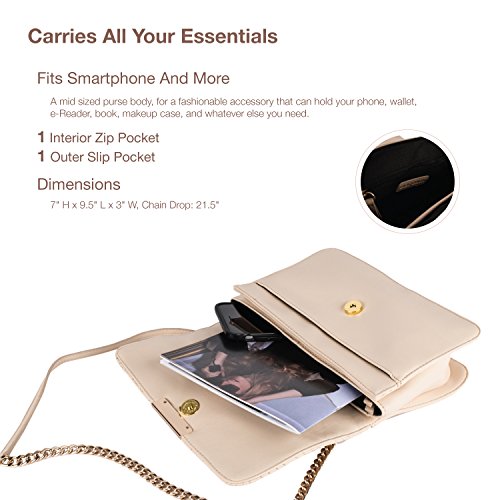 FITS SMARTPHONE AND MORE - A mid sized purse body, for a fashionable accessory that can hold your phone, wallet, ereader, book, makeup case, and whatever else you need. Dimensions: 7" H x 9.5" L x 3" W, Chain Drop: 21.5"