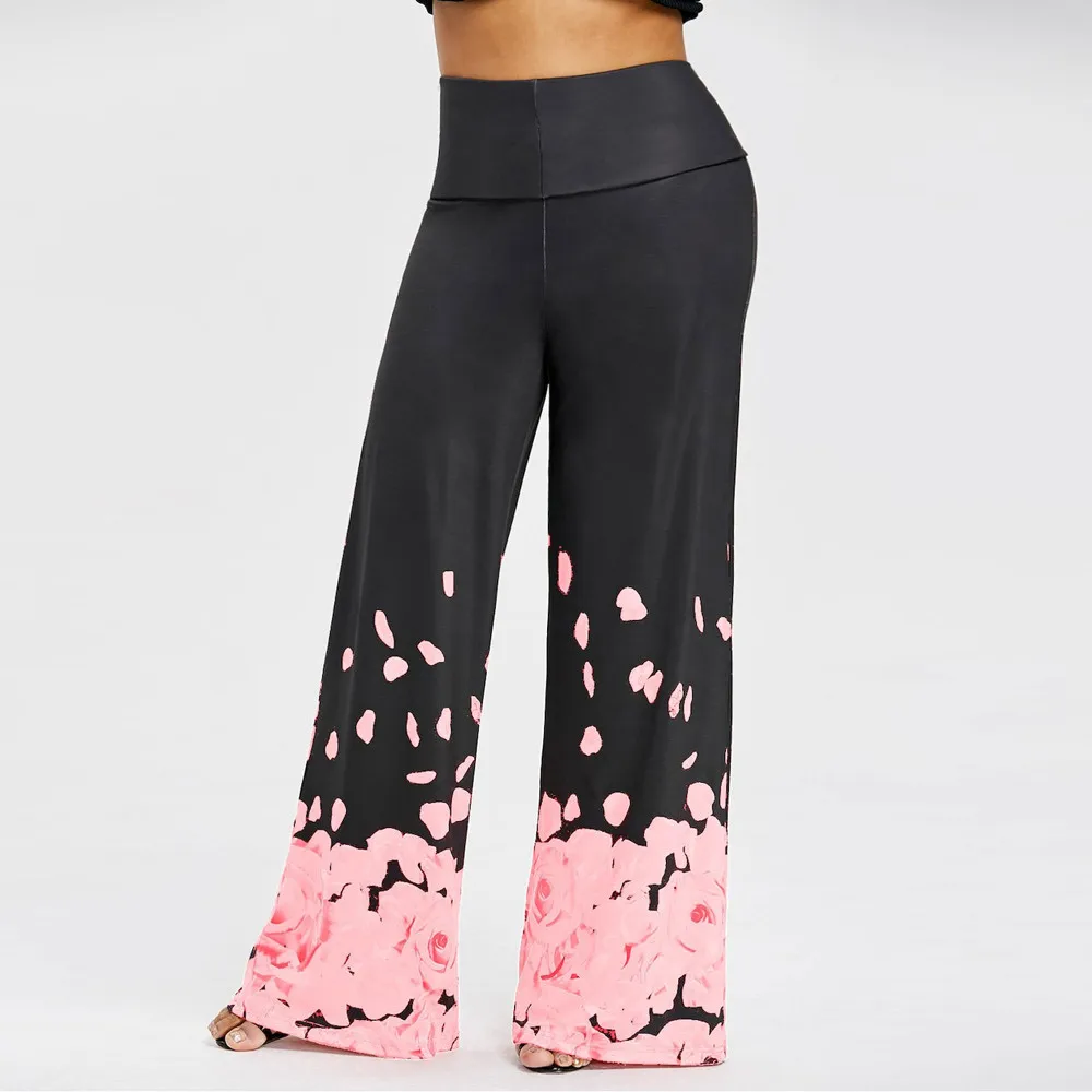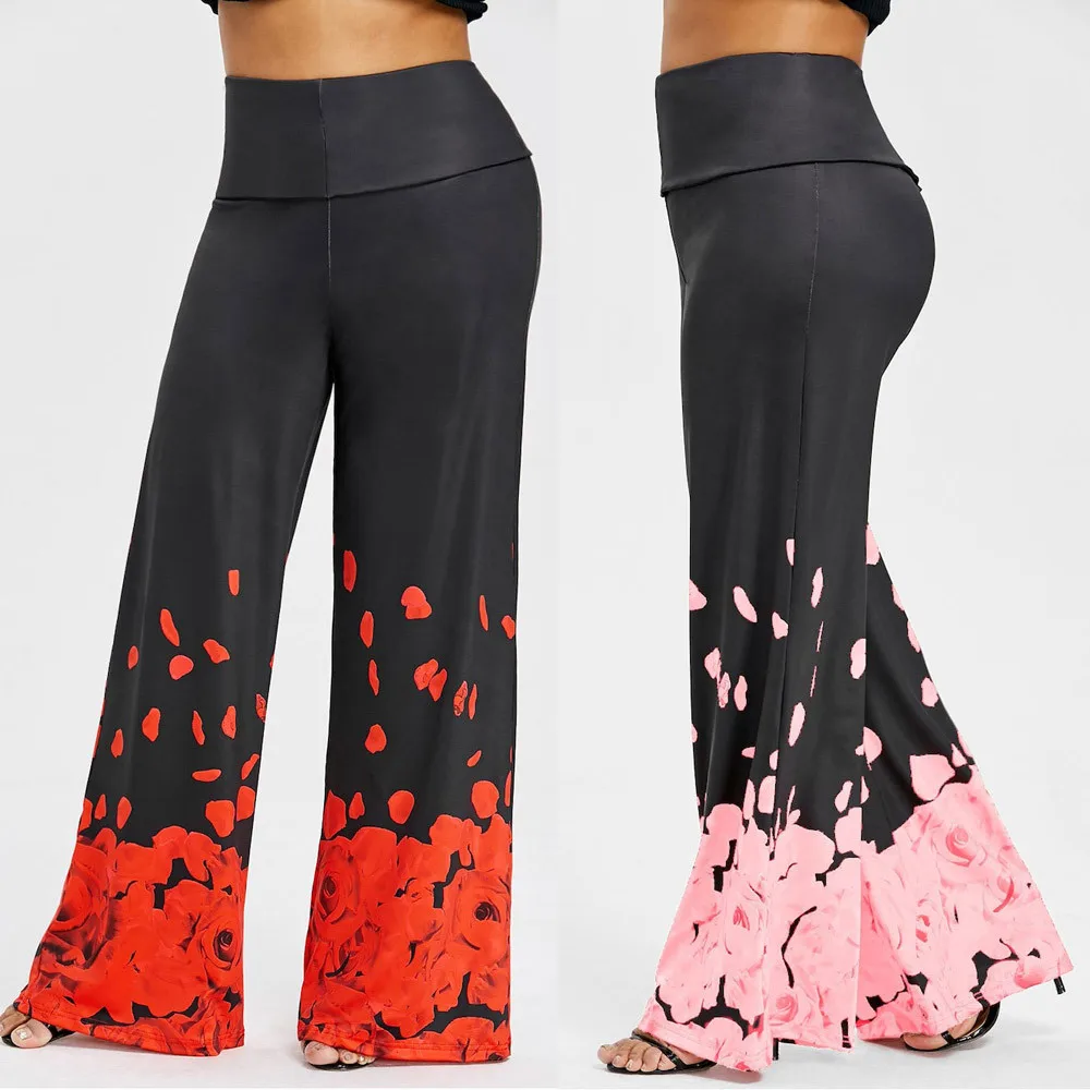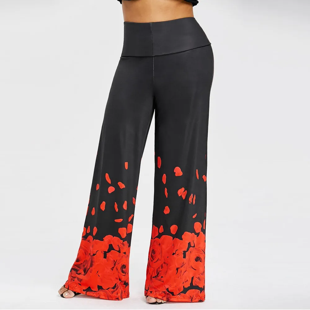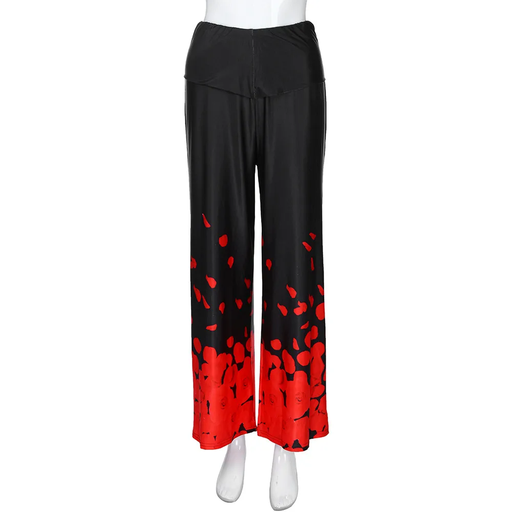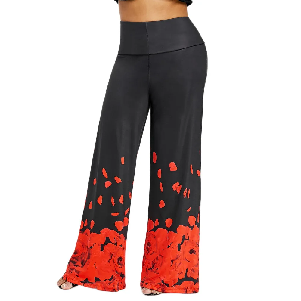 Large size ladies pants:Rose print loose casual trousers wide leg pants