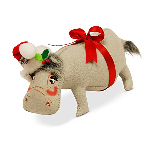 - This 6 inch gray hippo looks pretty comical with its long eye lashes and a red ribbon tied around its belly. The little Santa hat is cute too with the hatband done in white fabric with a winter berry print on it.