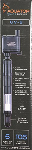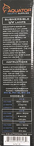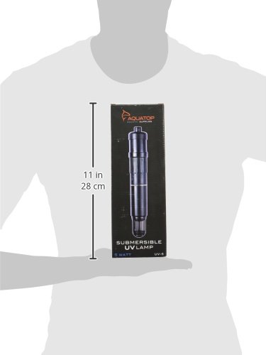 AQUATOP's Series of submersible UV Lamps are the perfect way to control free-floating micro-organism as well as disease causing pathogens. As water is pumped through these units with a compatible pump / power head(not included), the UV lamp clarifies and sterilizes the water, providing you with clear healthy water.Simply attach one of AQUATOP's Compatible Pumps/ Power Heads (not included) to the top of the Submersible UV Lamp. Submerge the compact assembly directly into you aquarium or sump and power on the units. The power head will draw water into the bottom of the unit running it by the UV Lamp to sterilize the water before it exits the pump / power head.Feature