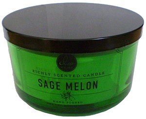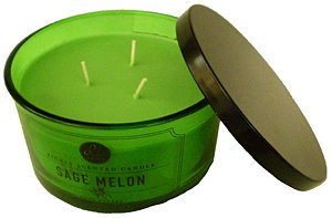 Decoware Richly Scented Sage Melon 3-Wick Candle 14.6 Oz. In Glass. Fruity melon combined with fresh herbal sage scent. Artisan made 3-wick soy blend candle that was hand-poured. Approximate burn time of 32 hours. Heavy green glass with black lid. Use indoor or outdoor. This Sage Melon aromatic scent is certain to create a welcoming, intimate atmosphere.