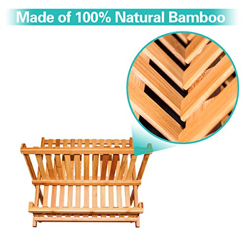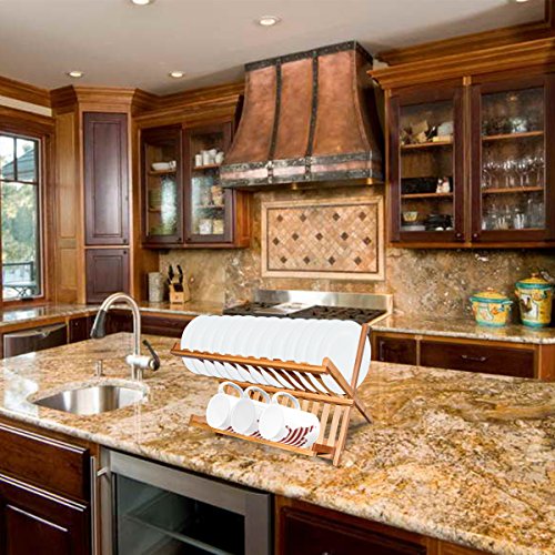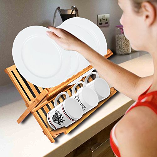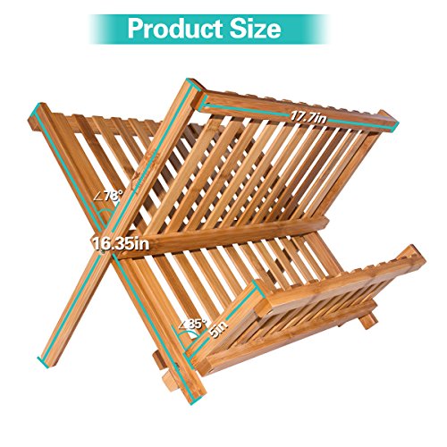 ★YOUR HEALTH IS WORTH IT:★ Put your dishes or bowls on the dish rack to prevent growing the bacteria. ★MADE OF 100% NATUARL BAMBOO:★ Bamboo is a natural alternative to wood, more environmental and recyclable. Finished without stain to keep the natural feeling.Bamboo is an eco-friendly natural resource that is harder and more durable than many wooden products, It absorbs less moisture and resists stains, odors and bacteria. ★MAKE IT STRECHABLE:★ When you don’t use it, fold to be flat for storage. ★MULTIFUNCTIONAL USE:★ Bamboo dish rack is a stylish and practical way to dry your plates, dishes, cups. Additional rack for cups or bowls. ★EASY TO CLEAN: ★ Clean with water and mild soap and then dry thoroughly. Product information Expanded Dimensions:16" x 9 .8" x 9 " Folded Dimensions: 16" x 12 5/8" x 1 5/8" 0 |