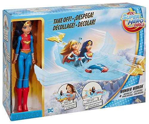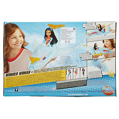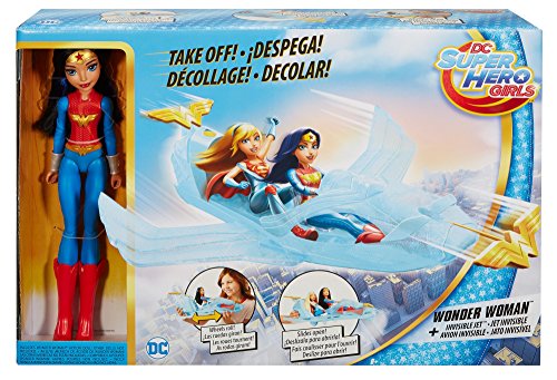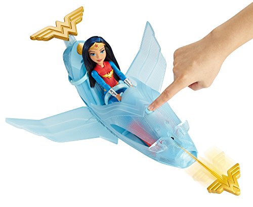 Soar into adventure with Wonder Woman action doll and her Invisible Jet! Surprise features add to the Super Hero power and storytelling fun. Inspired by the powerful students of Super Hero High, the DC Super Hero Girls are ready for any call to action with cool vehicles that can speed them to their destinations. Wonder Woman's Invisible Jet is one of the most iconic -- and coolest -- with surprises to wow fans and confuse foes! Press the button toward the back of the jet, then extend its body with a pull to reveal room for two. Each seat even has a seatbelt! Push the button toward the front of the jet and watch the iconic golden winged Wonder Woman emblem shoot from the hood -- it's a blast! A translucent sky blue body helps "hide" this Invisible Jet, and slim wheels let it roll into action. Dressed in an exclusive flying outfit, Wonder Woman action doll is ready for any mission wearing her signature red and blue detailed with her golden belt, silvery wrist cuffs and golden Wonder Woman emblem. Super Hero accessories includes her golden tiara and tall red boots. Young super heroes will love finding their own unique abilities along with the Super Hero High students. From mission practice to mission assignment, learn to unleash these characters' powers and explore your own inner hero! Collect all of the DC Super Hero Girls dolls and accessories to take on even bigger missions (each sold separately, subject to availability). Includes 12-inch Wonder Woman action doll and Invisible Jet with expanding and projectile features. Colors and decorations may vary.Feature