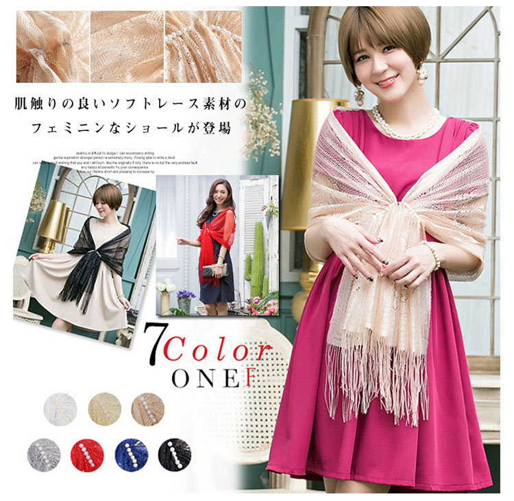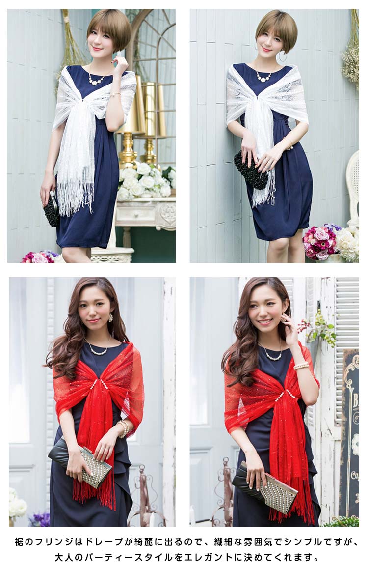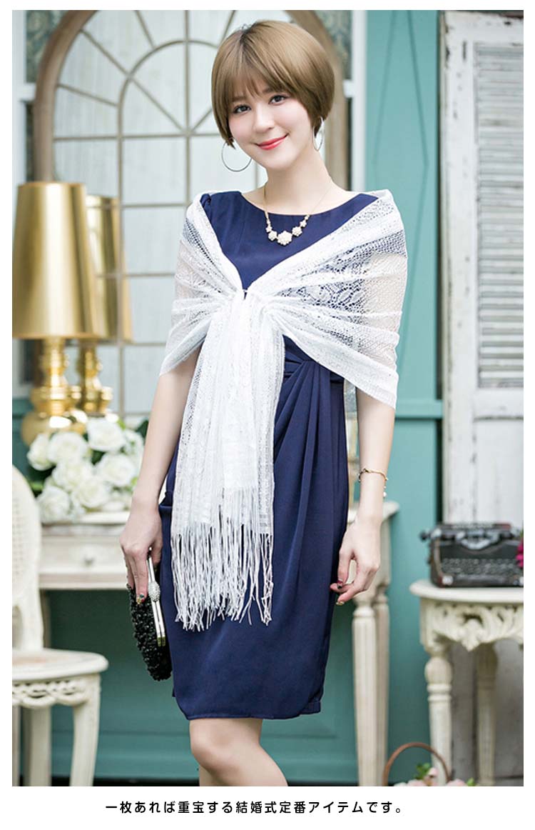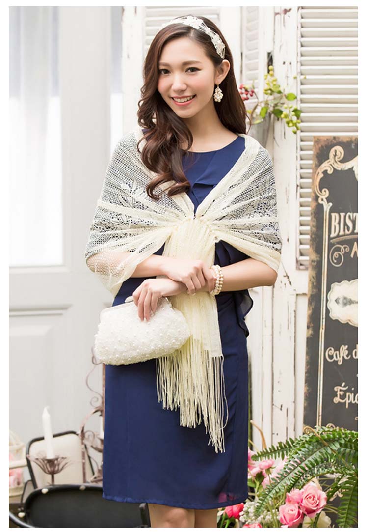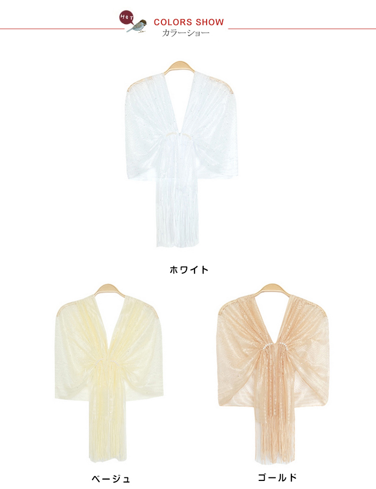 | 肌触りの良いソフトレース素材のフェミニンなショールが登場。胸元のパール調デザインがさりげなく可愛く華やかに見えます。裾のフリンジはドレープが綺麗に出るので、繊細な雰囲気でシンプルですが、大人のパーティースタイルをエレガントに決めてくれます。一枚あれば重宝する結婚式定番アイテムです。 | |
