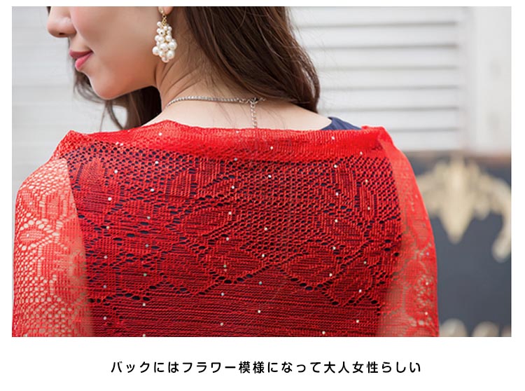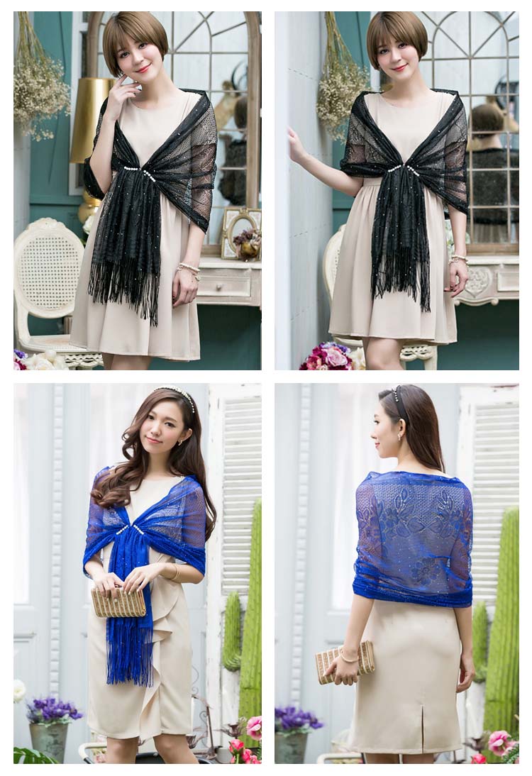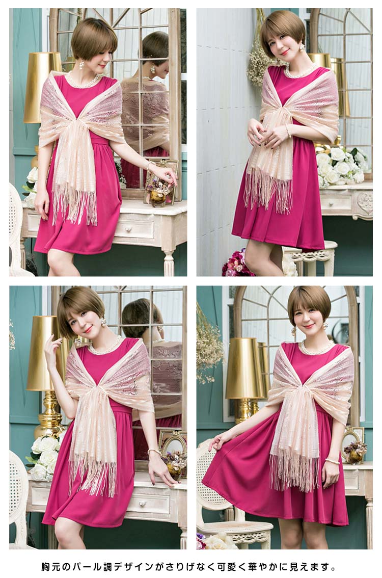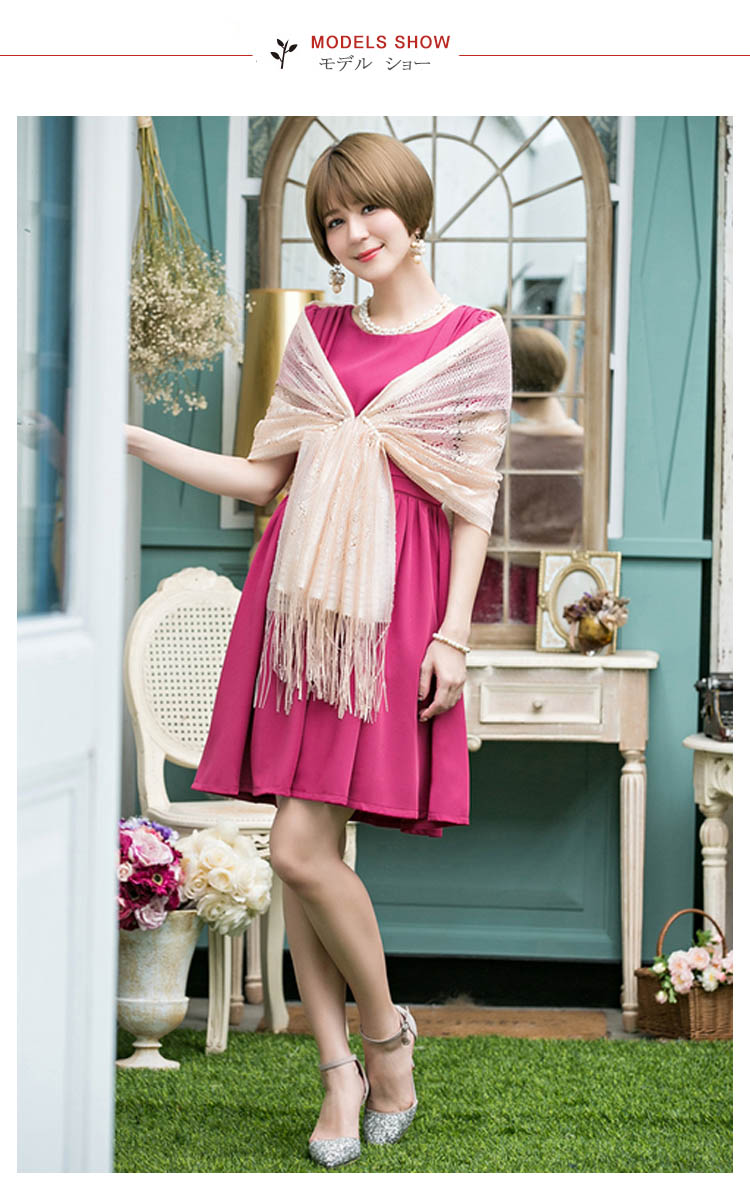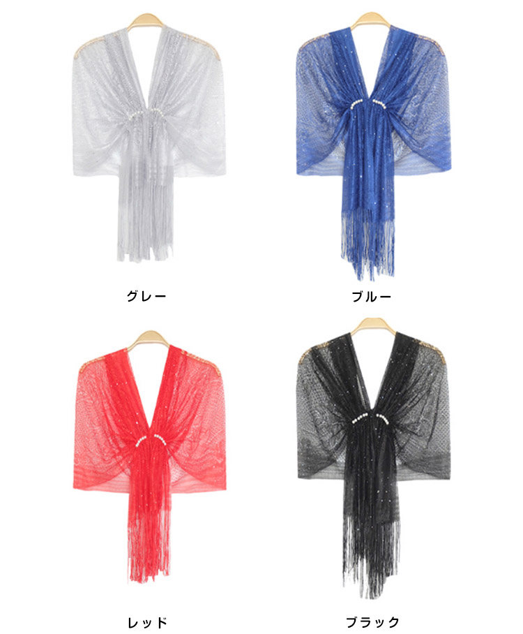 | 肌触りの良いソフトレース素材のフェミニンなショールが登場。胸元のパール調デザインがさりげなく可愛く華やかに見えます。裾のフリンジはドレープが綺麗に出るので、繊細な雰囲気でシンプルですが、大人のパーティースタイルをエレガントに決めてくれます。一枚あれば重宝する結婚式定番アイテムです。 | |