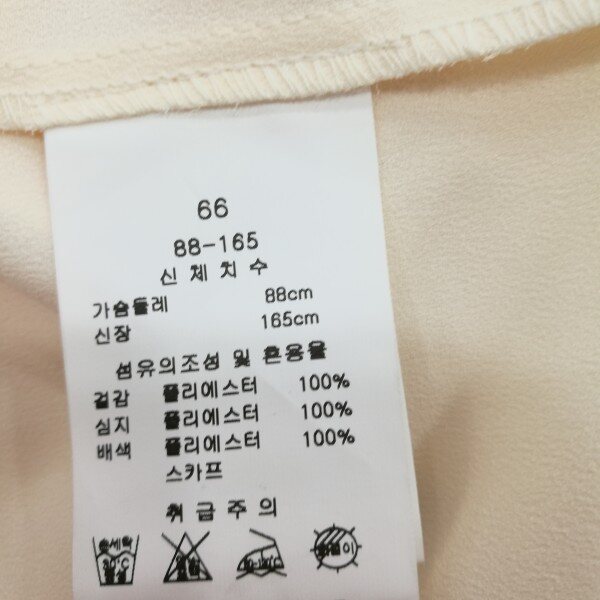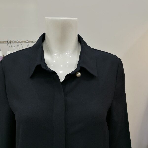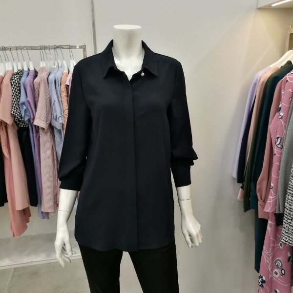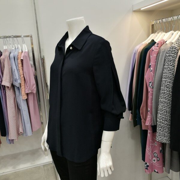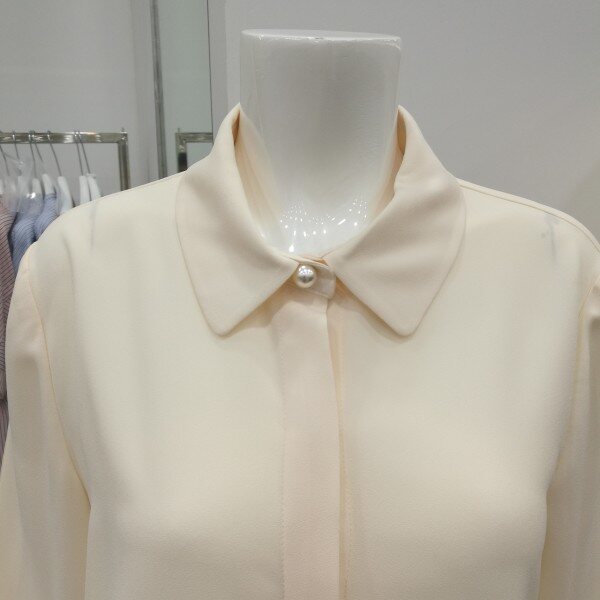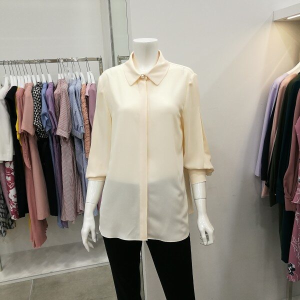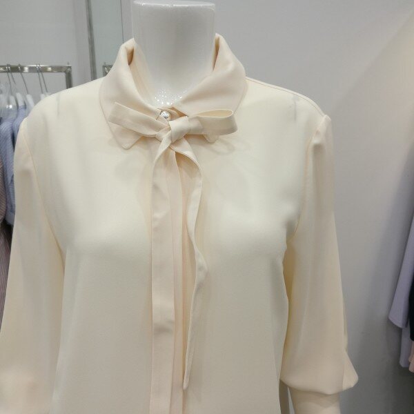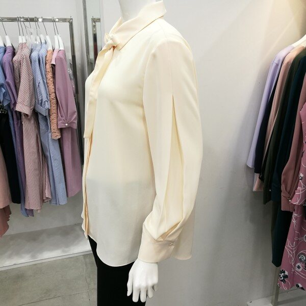 여성스러운 블라우스로 넥부분에 진주단추로 포인트를 주었고 소매부분은 벌룬소매처럼 시접을 주어활동하기 편하게 디자인 되었다. 또한 타이가 있어 다른스타일로 코디하기도 좋다.