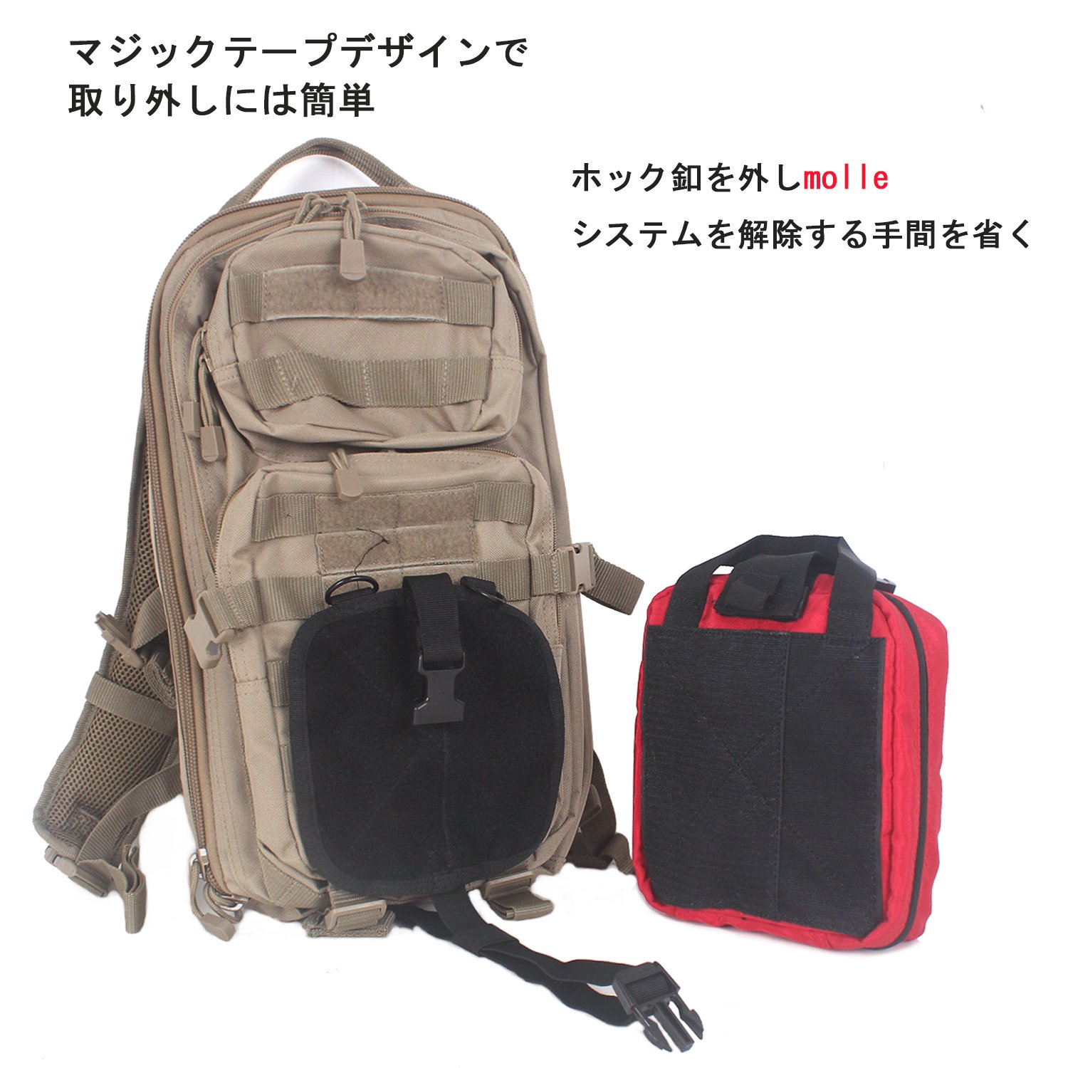 Magic tape is attached to the back side of the MOLLE system so if you paste the back of the pouch onto the Velcro, you can fix the pouch to the backpack.