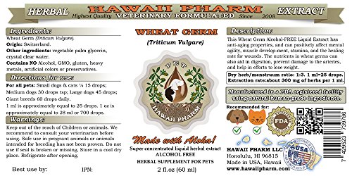 This Wheat Germ Veterinary Natural Alcohol-FREE Liquid Extract made from Dried Wheat Germ. It boosts the immune system and prevents cardiovascular disease. It has the ability to slow the ageing process and can stimulate mental agility and muscle development. This extract is also helpful for digestion, arteries and helps in efforts to lose weight. Any statements on this page have not been evaluated by the Food and Drug Administration. This product is Herbal Supplement and is not intended to diagnose, treat, cure or prevent any disease. We recommend that you consult with a qualified veterinarian before using this or any other herbal products.Feature