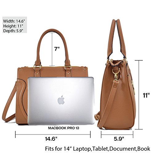 DIMENSIONS: 14.6"W x 11"H x 6"D / Handle Drop Length: 6.6" / Shoulder Strap Length: End to End 48" ; Fashionable, practical and multi-function design ; It can be used as a laptop (up to 14") purse, computer bag, folders bag, casual work bag, shoulder bag, women fashion handbag etc.