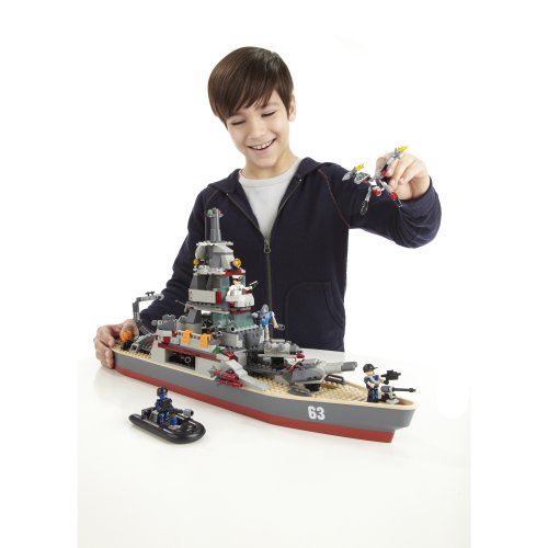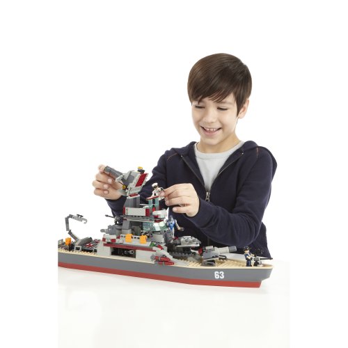 - Feature : Build the mighty U.S.S. Missouri / 6 customizable missile launchers with firing missiles / 3 interior levels ? including central control room, captain?s navigation tower, and soldier sleeping barracks with alien examination room / Working crane lifts the attack boat / Works with leading construction brands