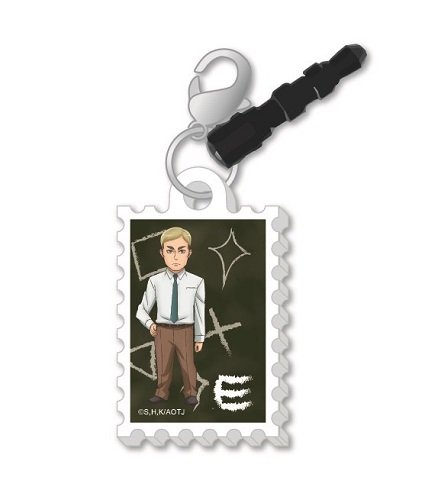 スマートフォンなどのイヤホンジャックにさすアクセサリーです。切手風プレートにプリントされた「進撃!巨人中学校」のキャラクターがとってもキュート!