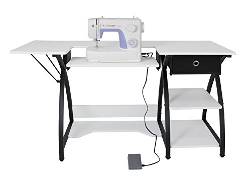 -. Feature : The SINGER 3232 Simple sewing machine is the perfect machine for beginner sewers. With an automatic needle threader, quick-and-easy threading, and adjustable stitch length and width, set-up is simple and frustration-free. / The 3232 sewing machine features including 32 built-in stitches, an automatic 1-step buttonhole, and a heavy-duty metal frame make fashion sewing and other creative projects fun and easy. / The Comet Sewing Table features a large 56.75W x 23.5D workspace for your fabric. (Top Dimensions: 47.25W x 23.5D With Leaf Down) / 23W x 10.75D Platform Adjusts to Accommodate the Height of the Sewing Machine Base so You Can Easily Glide Fabric While Sewing / The open storage shelves and cloth drawer provide ample space for bins, boxes and tools, keeping them off the tabletop