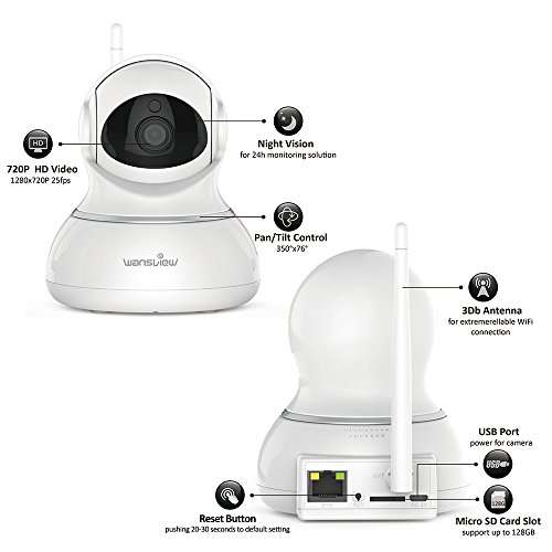 Why you should trust our 720p Pan/Tilt Wireless IP Camera: Stunning HD 720P (1280*720) video at 25fps. Videos and photos can be recorded and playback via local micro SD card( storage up to 128GB ,usually for continuously about 6 days recording) as well as your mobile phone 3 Dbi Antenna for extremely reliable Wifi connection Smart pan tilt and 4x digital zoom with wide-angle for complete coverage Remarkable two-way audio, talk and listen via mobile App is convenient Night vision up to 20 feet distance, living stream can be seen even in the dark Supports viewing on web browsers (IE, Firefox, Chrome),phone and tablet. Supports ONVIF 2.0 to 2.5 and compatible with Blue iris or iSpy etc Package list: Wansview Camera