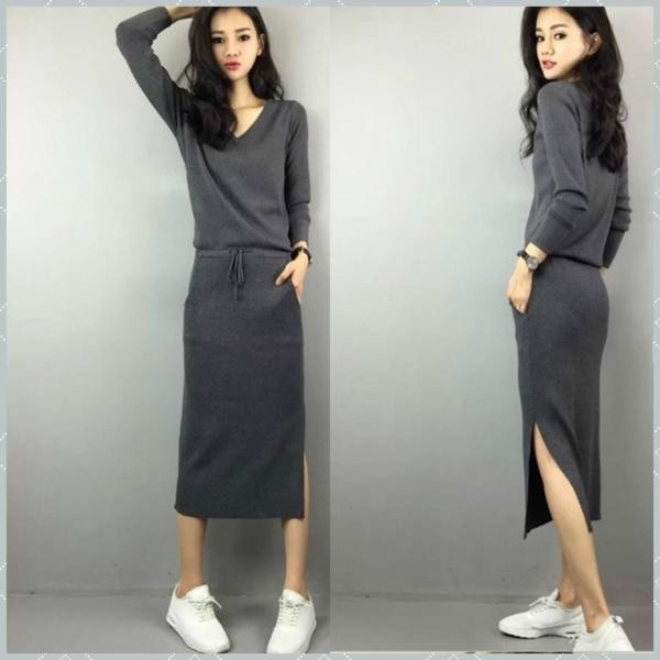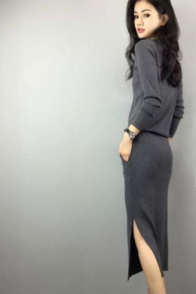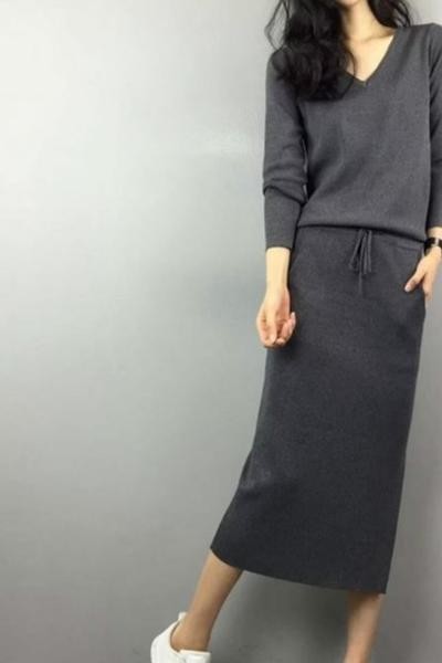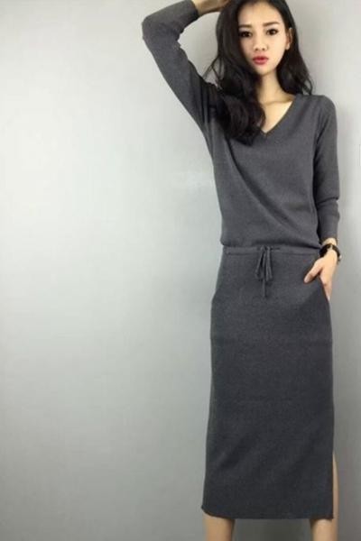 カジュアルスタイル Vネック 長袖 ミモレ丈  ワンピース