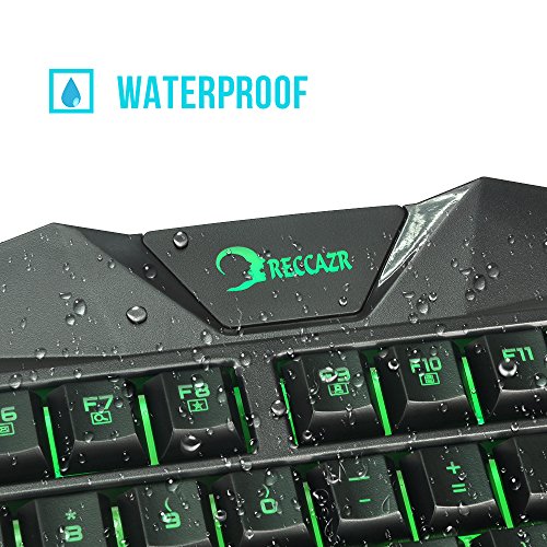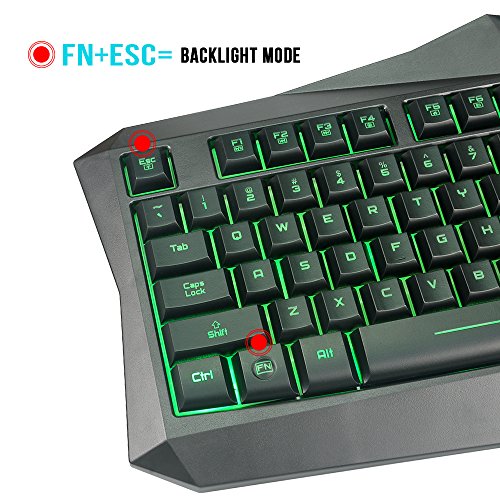 【full-size Gaming keyboard】This full-size keyboard With Numeric Keypad,Green/Blue/Cyan LED backlit keyboard with see through characters which can be using in the dark, press FN + ESC key to change color mode; Efficient waterproof design for 9 drain holes at the bottom can quickly discharge when the liquid was accidentally sprinkled on the keyboards