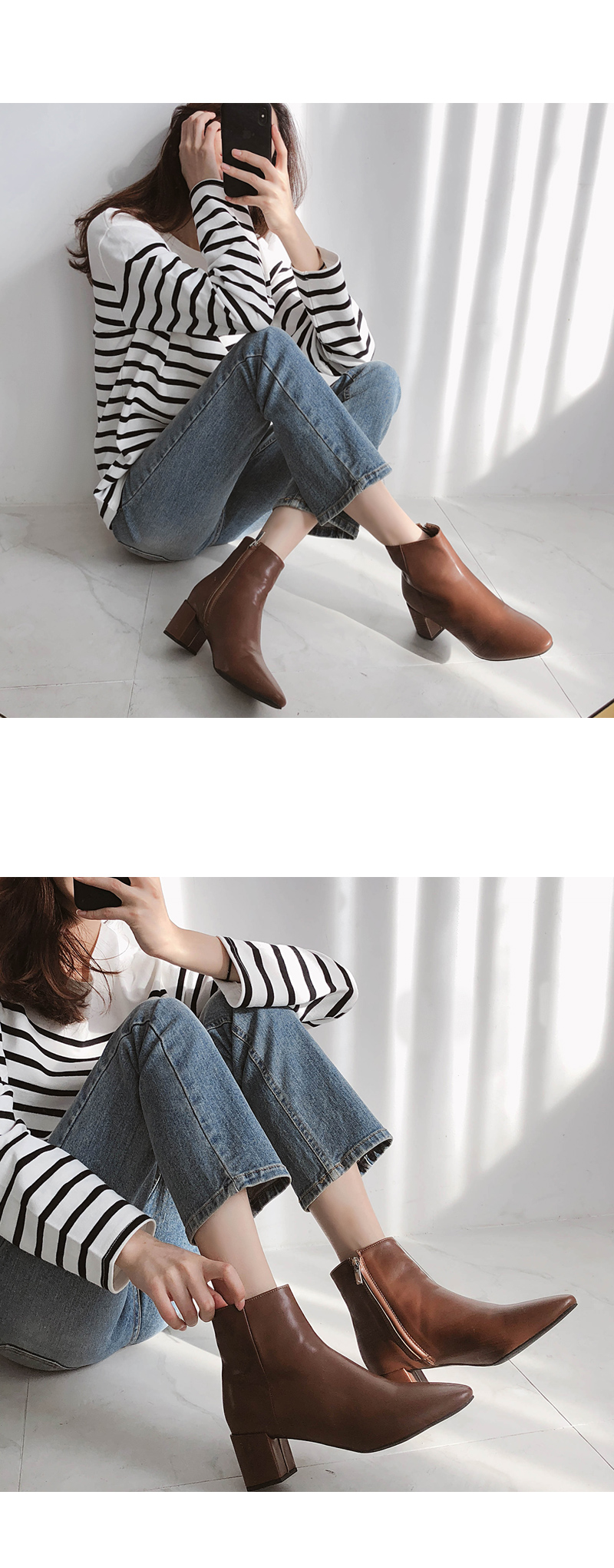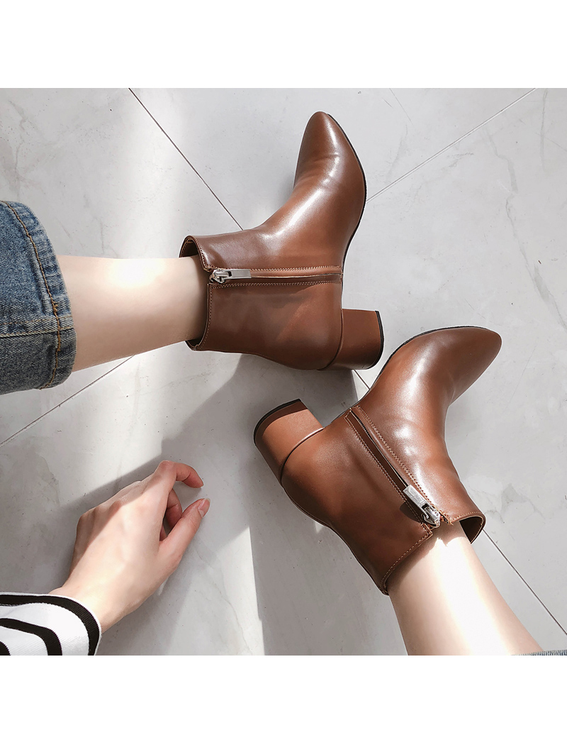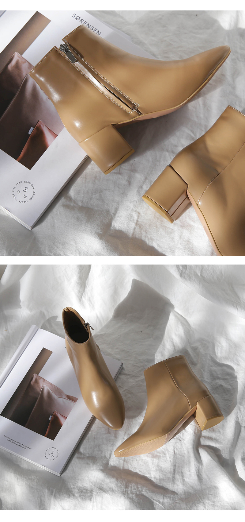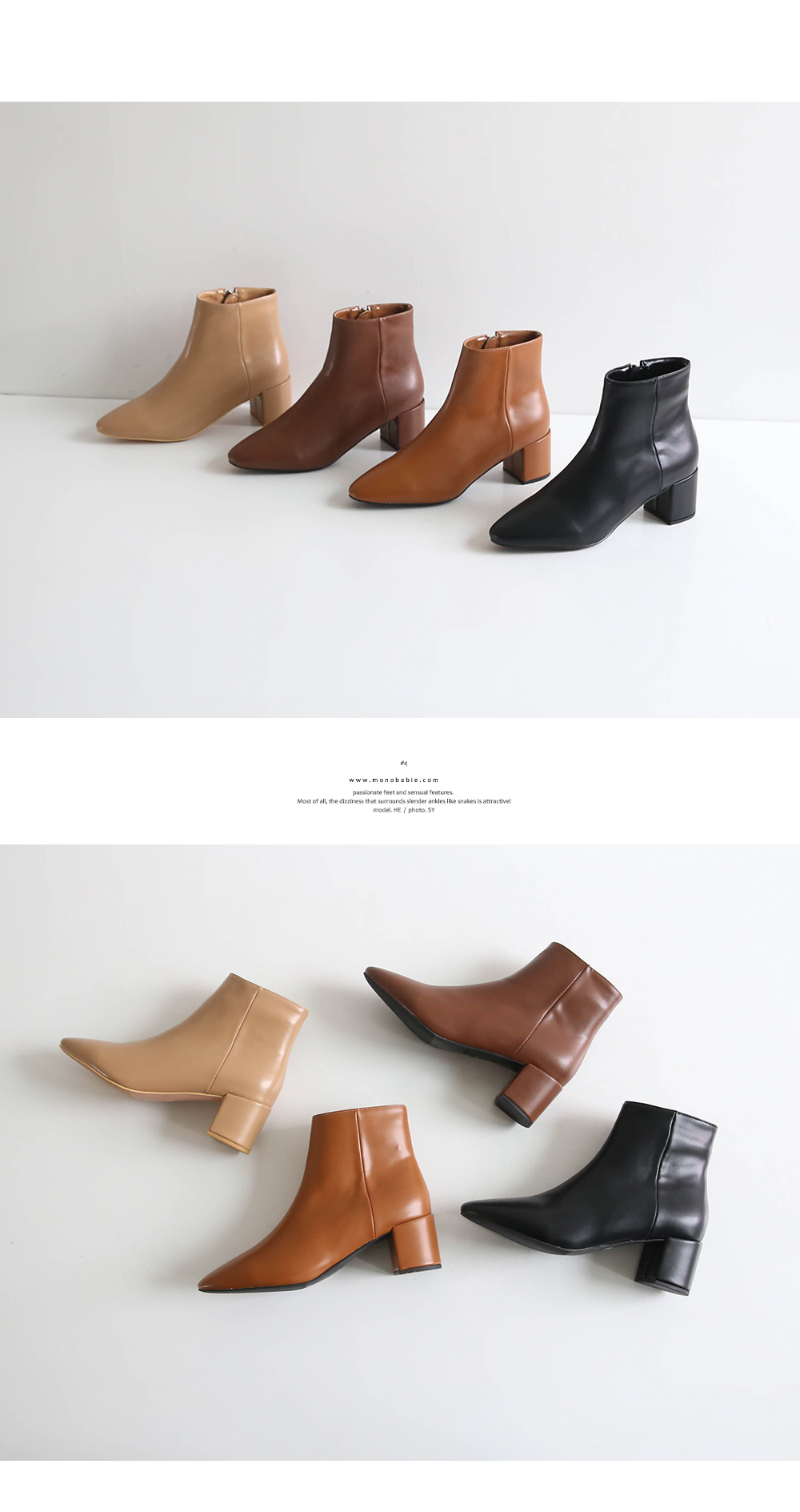 베이직한 살짝 라운드진 라인의 앵클부츠입니다. 가을시즌에 어우러지는 브라운 컬러톤으로 구성되어 부담없이 무드있게 착화 가능합니다.