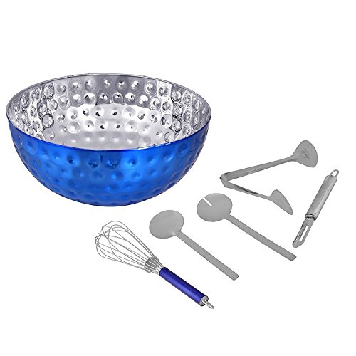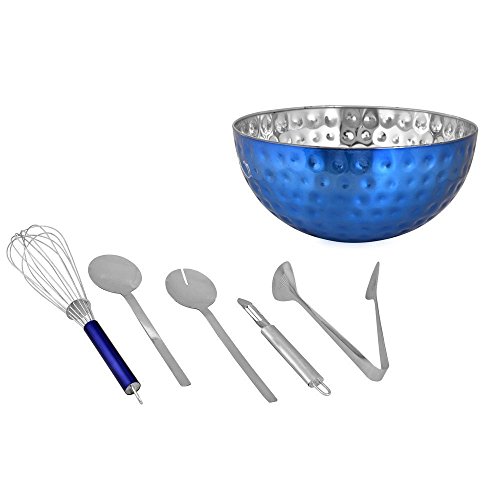 Kosma Stainless Steel Salad Bowl | 6 Piece Salad Set | Serving Set (Salad Bowl 36cm In a Blue Colour and Hammered Effect, 2Pc Salad Server Set, Whisk 30cm, Salad Serving Tong, Vegetable Peeler)