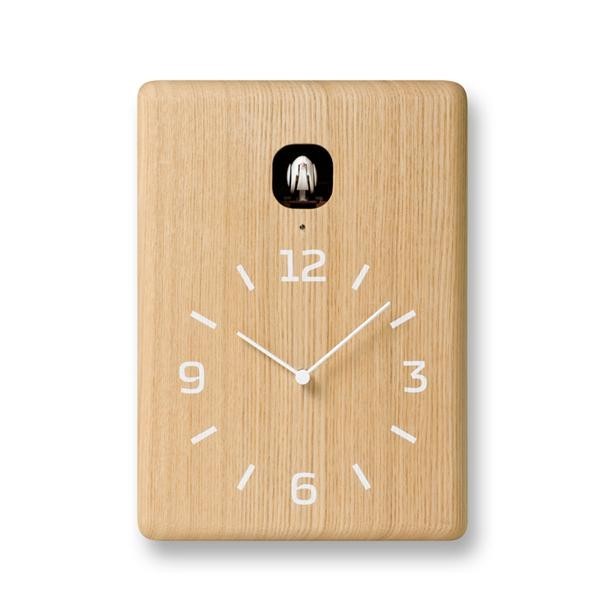 小川のせせらぎの音と共に、愛らしいカッコーの鳴き声で時を告げる時計です。シンプルな巣箱を模した形状は、壁掛けはもちろん、置時計としても使えます。無垢のタモ材の木目を生かしたナチュラル・ブラウン、純白に仕上げたモダンなホワイト、木の木目を残した高級感のあるブラックの4種類からお選び頂けます。ライトセンサー機能付きで、就寝時など消灯時には小鳥もお休みするので安心です。 |