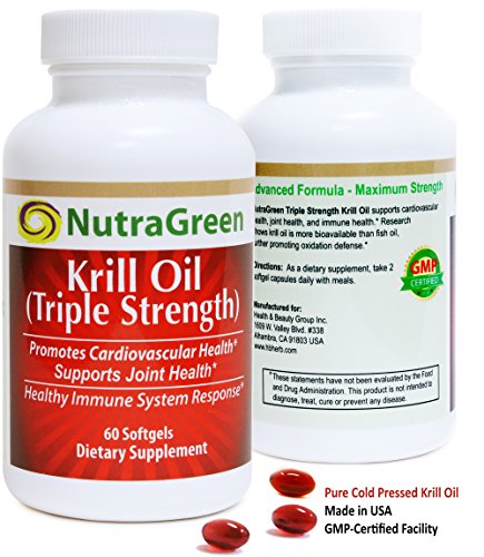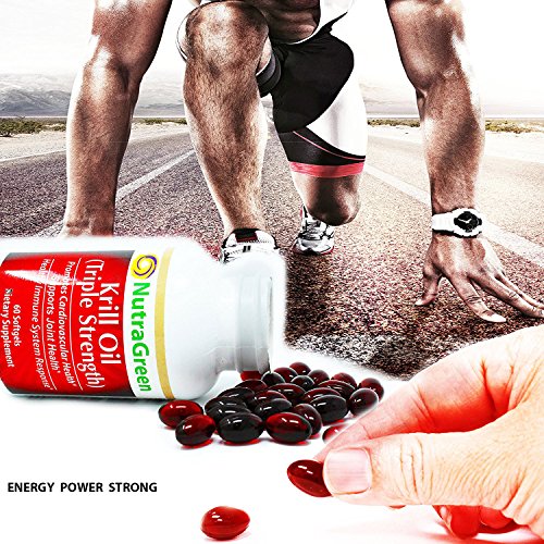 -. Feature : Krill Oil Triple Strength with Complex Omega 3 Fatty Acids: a concentrated Antarctic krill source of DHA & EPA essential oils to support a healthy heart, maintain clear inflammatory pathways for cardiovascular health and immune system response / Powerful Antarctic Astaxanthin Antioxidants for Radiant Skin and UV-Light Protection: providing optimal skin health and proactively fighting free radicals to protect the skin from wrinkles or cancerous sun exposure / Joint Pain Relief and Anti-Inflammatory Properties: with the capabilities to reduce chronic inflammation that cause aches and stiffness; helping maintain pain levels & increase your mobility and flexibility throughout the day / Help Maintain Healthy Cholesterol Levels by Lowering Triglyceride Counts: phospholipids help krill oil's EPA and DHA fatty acids inhibit cells at more efficient rates than fish oil, meaning your body can absorb antioxidants that can help maintain healthy cholesterol balance, supporting cardiovascular needs / Manufactured in the USA: NutraGreen health supplements are GMP-certified & produced at a FDA-Registered facility; to ensure quality sourcing, high potency and purity