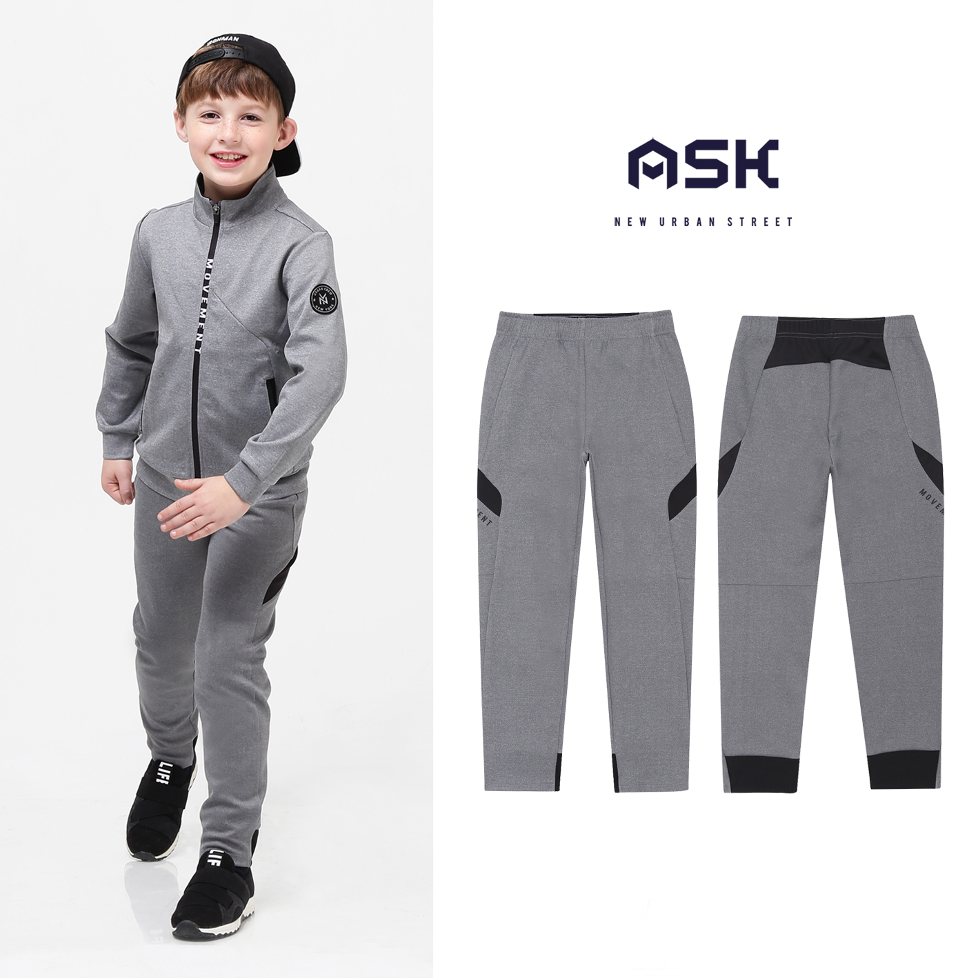플리쿠션지 소재의 트레이닝팬츠 와끼절개배색에 나염을 넣어 포인트를 준 기본 아이템으로 JB1MTC191UL 과 세트착장