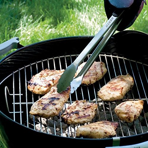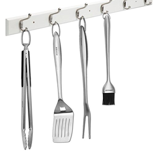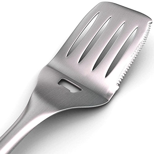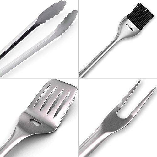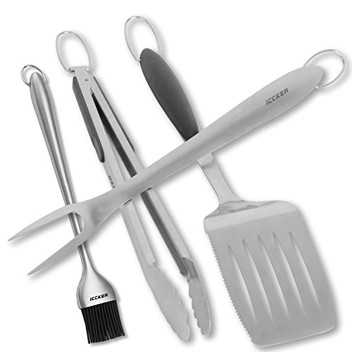 ICCKER fork and spatula are each made of a single piece of thick stainless steel. The turner is extra large to allow you to flip huge steaks and burgers. The leading edge tapers thin for easy sliding under food and has a super sharp cutting edge on the side. The tongs can be locked closed and have a scalloped ends to avoid tearing delicate food. Finally, each tool comes with a huge hanging loop for easy storage.