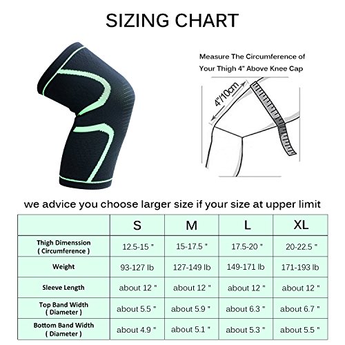 -. Feature : ✅ Triple Anti-Slip Silicone Dot on Both Upper and Bottom Band of Knee Sleeves: When we wearing the compression knee brace to squats or workout, the knee sleeves brace may always slipping or sliding, considering this issue, our knee compression sleeves make a improvement of it's design with triple silicone dot on both ends of the sleeves for a excellent grip, which makes the sleeves offer you a good stability to stay in place during activities / ✅ 12 Inch Long Knee Sleeves Has Great Stretch Capability for Sports: 12 inch long sleeves allows your knees get more coverage. More coverage means more support and more carryover. It gives you ample support without compromising mobility during lifts. The sleeves will not restrict your knees moving, it's great for lifting and squats, running, basketball, soccer, volleyball, tennis, weightlifting, fitness, cycling, hiking, crossfit, gym, exercise and training, etc / ✅ Breathable and Comfortable: Our compression knee sleeves made from super elastic yarn to support full mobility. The 3D circular knitting technology makes the fabric breathable for comfort wearing. The sleeves is durable, anti-odor, moisture absorption and breathable, keeps your skin dry and comfortable. It gives you ample support without compromising mobility during lifts. The seamless feature, makes it without tags or seams on the knee sleeves to cause any chaffing for discomfort / ✅ Sizing Helping: 4" above from the knee cap, measuring the circumference of the thigh. Recommend thigh circumference S: 12.5- 15" (recommend weight: 93-127 lb); M: 15 - 17.5" (recommend weight: 127-149 lb); L: 17.5 - 20" (recommend weight: 149-171 lb); XL: 20-22.5" (recommend weight: 171-193 lb), more knee sleeves size options means that you can be more precise with exactly how small the knee sleeve actually is, allows you to size down effectively for men, women, youth, teens or kids / ✅ Compression to Relief Knee Pains: For people who are experiencing osteoarthritis in your knee, knee sleeves is an effective solution to reduce knee pains. For some of us, knee sleeves is a preventative measure. The sleeves keeps your knees warm and provide enough support helps improve the blood circulation, reduce the inflammation and swelling in the knee area, allows faster relieve knee pains from arthritis, tendonitis and common injuries as runners knees from exercise, workout and training