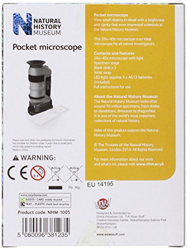 Studio : GadgetCenter Publisher : GadgetCenter Binding : Toy Product Description With this pocket sized microscope you are able to view small objects in high detail with brightness and clarity that even impressed scientists at the Natural History Museum. It has 20-40 x magnification which makes it ideal for viewing coins, print and nature. The bright LEDs and focus wheel ensure pin sharp images. The Natural History Museum Pocket Microscope is weighted and has a high quality rubberised body construction. 0