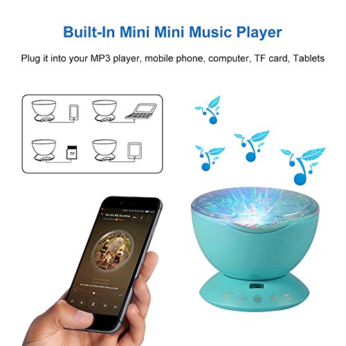 - Built-In Music Player -- The ocean wave light projector comes with four hypnotic music, and TF card can be used. So, you can connect external audio source (phone, MP3, PC, Tablet) , and enjoy the wonderful music and the dream light