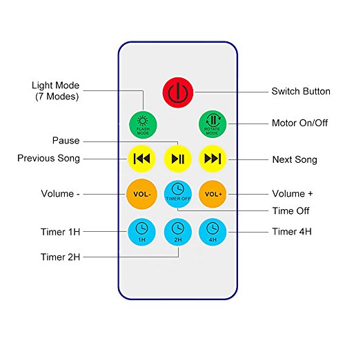- Easy To Use -- Turn on the bottom switch and long press the power button for 3 seconds to turn the light on/off. Change light modes and music,volume up/down by buttons or remote control. Also can use the controller to set timer of 1/2/4 hours to turn off the projector automatically