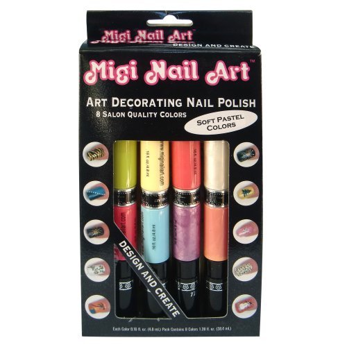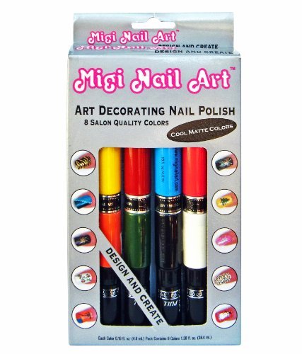 Create your own fabulous salon quality nail are. Save money by creating your own professional-style designs on your fingernails and toenails right at home. Our unique two-way art pen tip and brush allows you to apply a base color, and then create sophisticated works of art with the detailed pen tip. Great for everyday and holiday designs, fun for all ages. Each set comes with 8 high fashion salon colors, an instruction booklet with a step-by-step guide and a cleaning pin.Feature