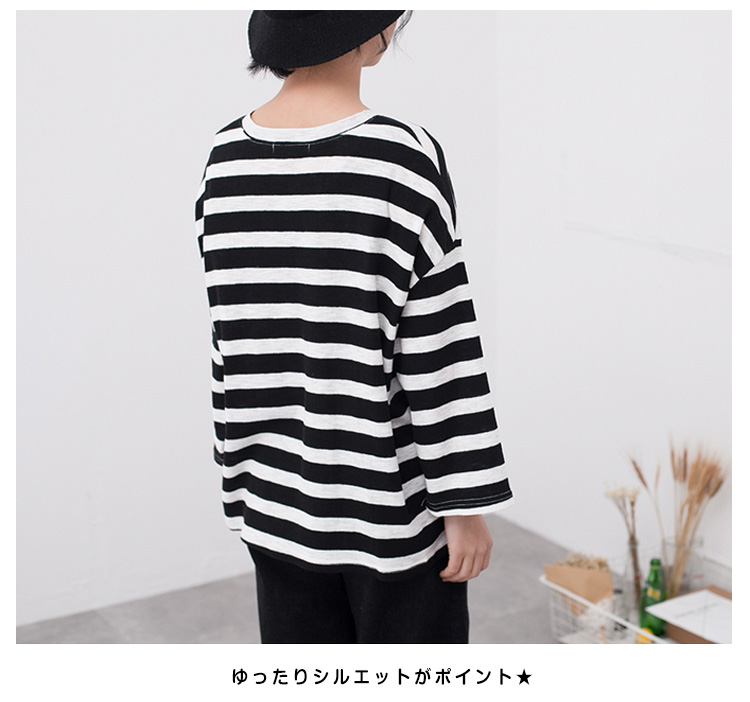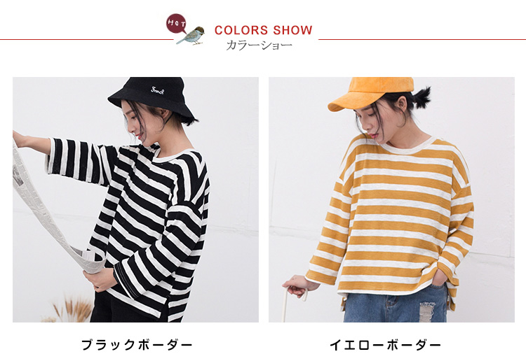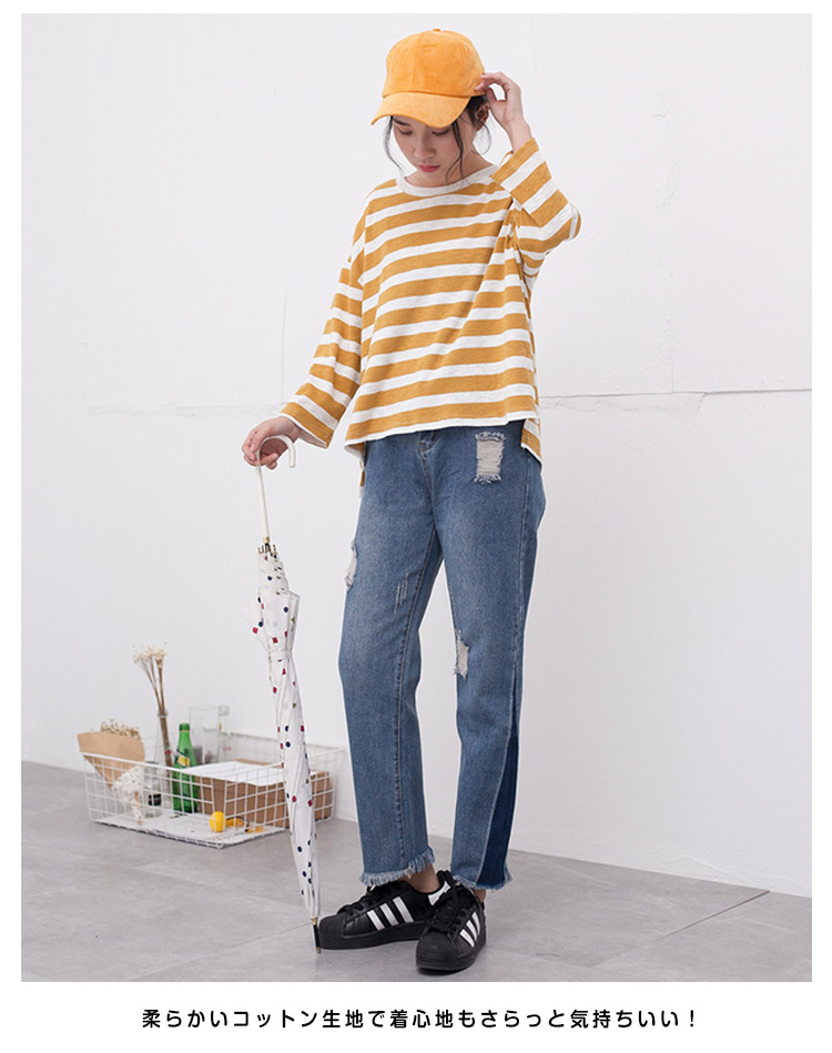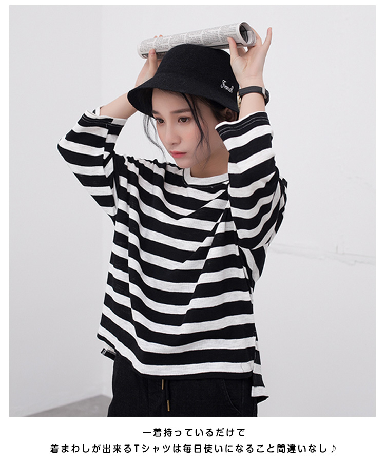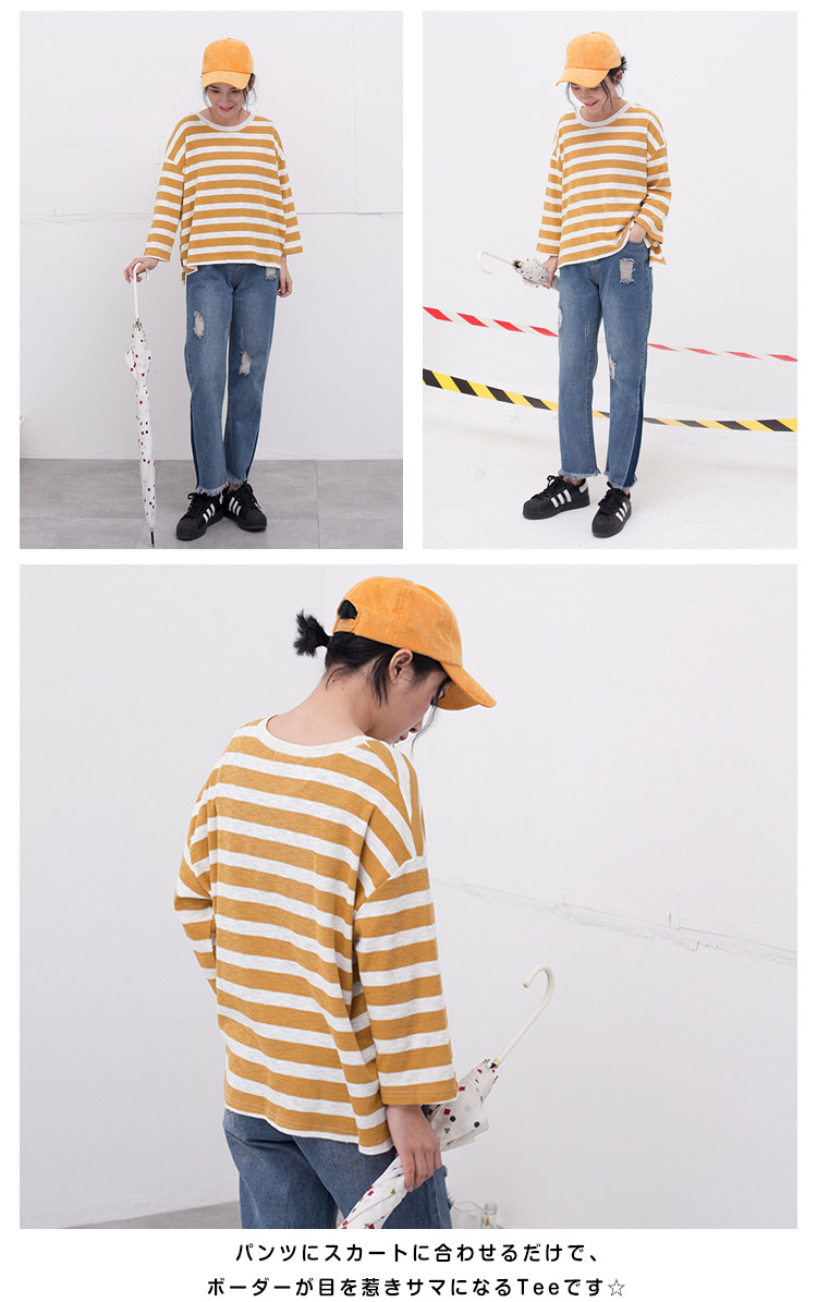 | ボーダー柄がカジュアルな印象で大人可愛いTシャツです♪柔らかいコットン生地で着心地もさらっと気持ちいい!パンツにスカートに合わせるだけで、ボーダーが目を惹きサマになるTeeです☆ 一着持っているだけで着まわしが出来るTシャツは毎日使いになること間違いなし♪ | |