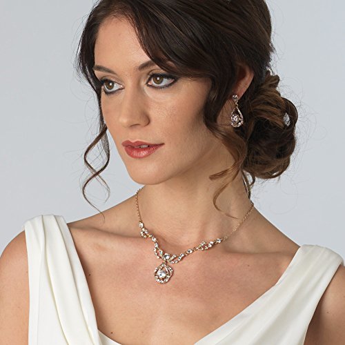 An amazing contemporary design that is hand-crafted with chunky round Genuine Austrian Rhinestones on gold plate. This set lays beautifully on the neckline, as the drop pendant gives it just the right amount of drama. The center design measures 4 3/4 inches wide with the drop at 1 ½ inches. The necklace measures 14 to 17 inches and can be adjusted with the attached extender chain for just the right fit. The stunning matching earrings measure just over 1 1/4 inches long.Feature