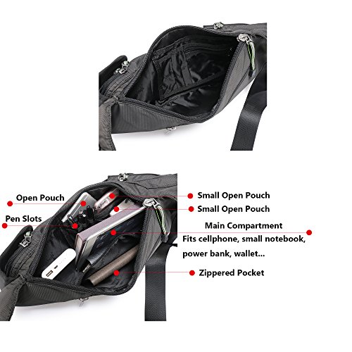 - ROOMY - It has a large main compartment with two small zippered pockets and two open pockets inside. External: 3 front zippered pockets, 1 open pouch, 1 back zippered pocket. A headphone cable hole on the front flap, it is convenient for you when you need to use your headphone.