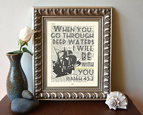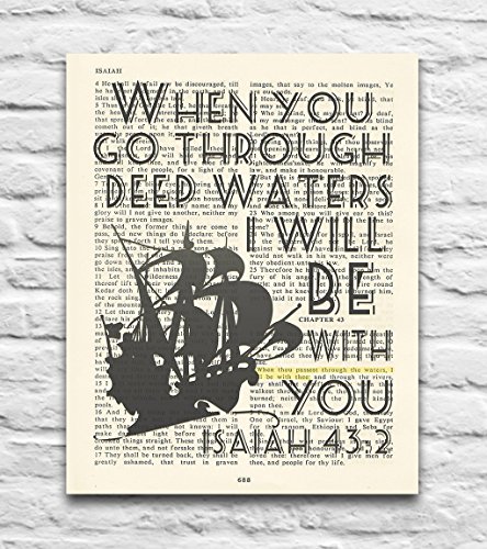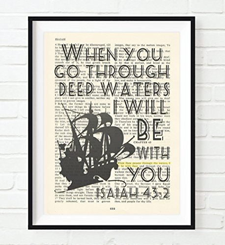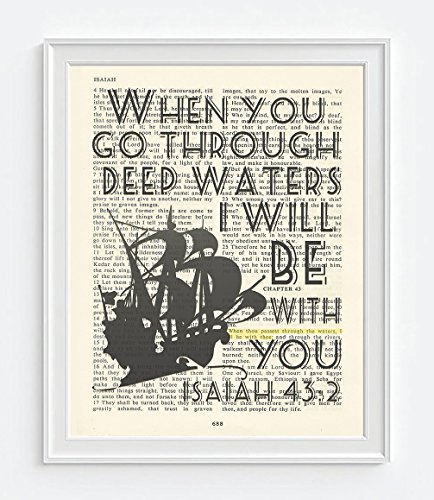 This 8x10 UNFRAMED reproduction print of a highlighted King James Bible scripture is sure to bring encouragement or hope to someone. We scan real pages from old Bibles (thus they have slight flaws and aging such as bleeding words from the other side, because the pages are so thin), which just adds to the character. This is a perfect inspirational and encouraging gift. The highlighted Bible page is in the King James Version: "When thou passest through the waters, I will be with thee"