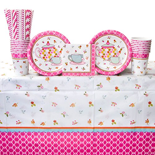 -. Title : Tea Time Party Supplies Pack for 16 Guests: Straws, Dessert Plates, Beverage Napkins, Cups, and Tablecover (Bundle for 16)