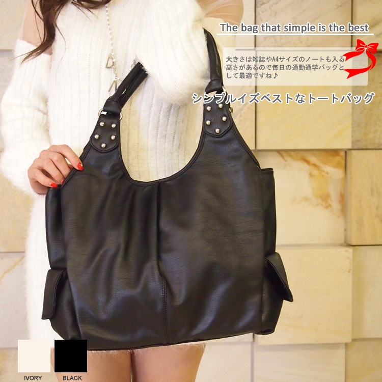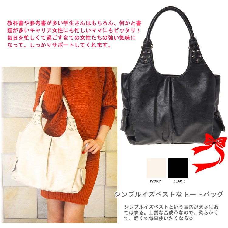 | スタッフより | シンプルイズベストという言葉がまさにあてはまる。大きさは雑誌やA4サイズのノートも入る高さがあるので毎日の通勤通学バッグとして最適ですね。上質な合成革なので、柔らかくて、軽くて毎日使いたくなる☆コーディネートを選ばないから、迷った時にいつもこれ!教科書や参考書が多い学生さんはもちろん、何かと書類が多いキャリア女性にも忙しいママにもピッタリ!毎日を忙しくて過ごす全ての女性たちの強い気味になって、しっかりサポートしてくれます。 |
