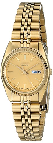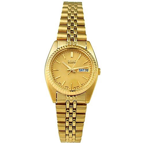 This attractive ladies watch is crafted from gold-toned stainless steel and features a gold dial set in a fluted gold-toned bezel. Other features include three-hand function with luminous hands and markers and an English/Spanish day-date window at the three o’clock position. The gold-toned bracelet-style band is crafted from links of stainless steel and fastens with a fold over clasp. This watch features Japan quartz movement and is water resistant to 30 meters.Feature
