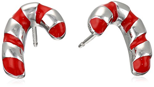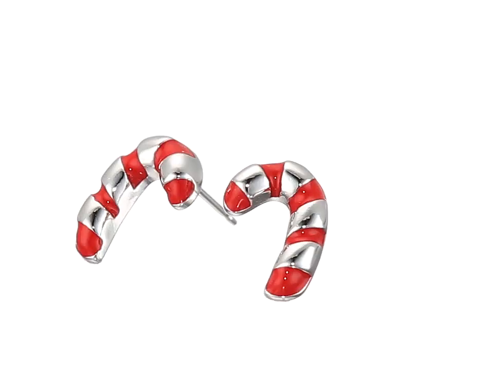 Rhodium Plated Sterling Silver Epoxy Candy Cane Stud Earrings