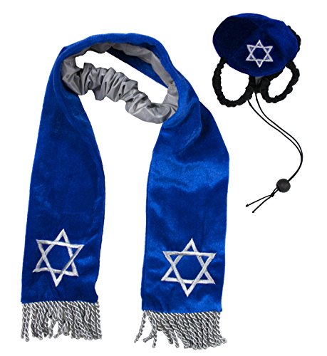 This year, we're helping dogs join in the holiday cheer. Our Hanukkah Hat and Tallis set includes an elastic neck band that stretches to fit most neck sizes and an elastic chin strap that adjusts to the perfect fit. Buyer beware: dogs donning these festive costume sets have been known to cause cuteness overload!.Feature