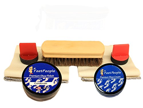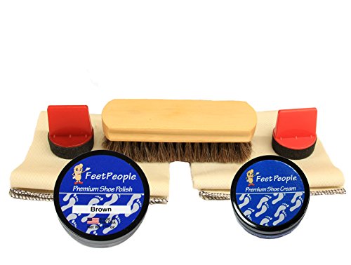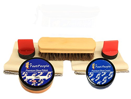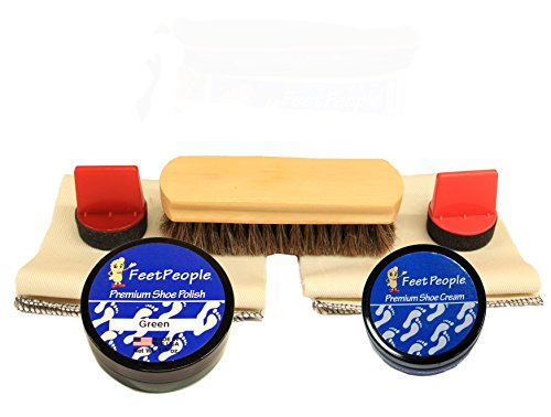 Studio : FeetPeople Publisher : FeetPeople Product Description The FeetPeople Premium Conditioning Kit contains all the things you need to clean, nourish, buff, and shine your shoes. Our kit includes one jar of our patented FeetPeople Premium Shoe Polish that is a blend of pure carnauba wax, beeswax and the finest grade of other ingredients. One Jar of our patented FeetPeople Premium Shoe Cream which is a rich and creamy boot and shoe polish that gives a beautiful and conditioning shine. Ideal for smooth leather, this honored formula is blended from the finest waxes. Also good for colored leather purses. Two FeetPeople Sponge Daubers that allow you to apply paste or cream polish quickly and easily. One FeetPeople 100% Horsehair Shine Brush that has been designed to provide a nice buff finish for your shoes. This shine brush is simply packed with horsehair to make shining those shoes and boots much easier. While most shine brushes have 5 rows of horsehair, this brush has 6 rows, providing even more buffing power. Professional Shoe Shine Buffing Cloths to use after you completing apply the shoe polish on the shoe and done with the brushing. Use the shine cloth to obtain that mirror like finish. 0
