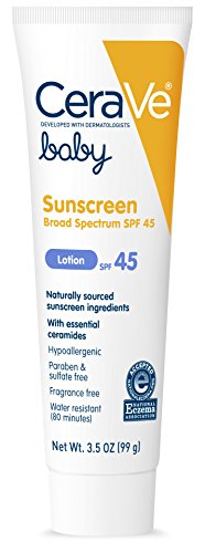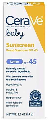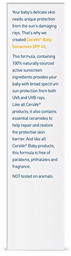 Your baby's delicate skin needs unique protection from the sun's damaging rays. That's why we created CeraVe baby sunscreen SPF 45. This formula, containing 100 percent naturally sourced active sunscreen ingredients provides your baby with broad spectrum sun protection from both UVA and UVB rays. Like CeraVe products, it also contains essential ceramides to help repair and restore the protective skin barrier. And like all CeraVe baby products, this formula is free of parabens, phthalates and fragrance. Not tested on animals. Essential ceramides help repair and restore the protective skin barrier. Won't run into baby's eyes.Feature