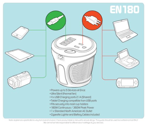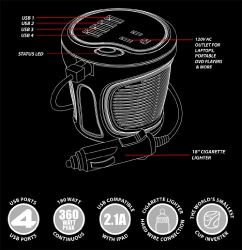 - Title : ENERGIZER 180W Cup Inverter 12V DC cigarette lighter to 120V AC to power laptop notebook & more w/ 4 USB ports 2.1A shared compatible with iPad & more