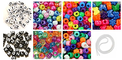 Kit includes 6x9mm plastic pony beads, plus plastic alphabet beads, bead shapes and string, includes about 2900 beads plus stretch cord