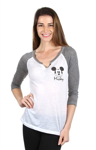 This henley style raglan sleeve shirt is good for all weather! Features Mickey Mouse on the left of the shirt, with the old school mickey style.